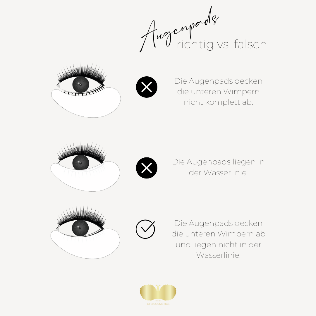 Die präzise Platzierung der Augenpads ist von entscheidender Bedeutung, um den Komfort und die Sicherheit Ihrer Kunden während der Wimpernverlängerung oder des Lash Liftings zu gewährleisten. Hier ist ein Vergleich zwischen der richtigen und der falschen Platzierung: