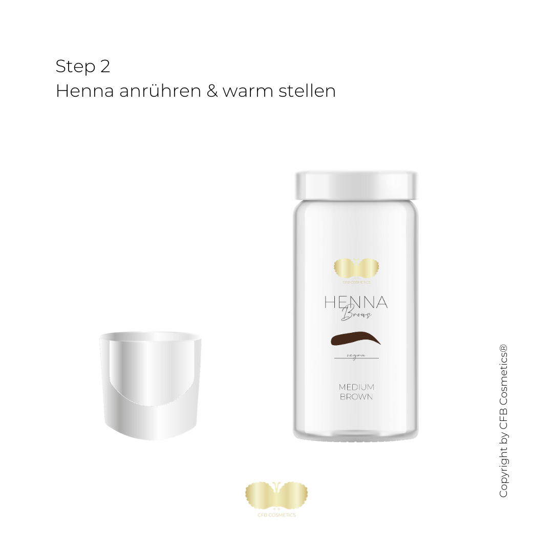 - Mischen Sie Henna mit ca. 60 - 80 °C heißem Wasser oder mit Rosenwasser. Je flüssiger die Konsistenz, desto stärker ist der Tattoo Effekt. Fügen Sie 1–2 Tropfen unseres Brow Oils hinzu.