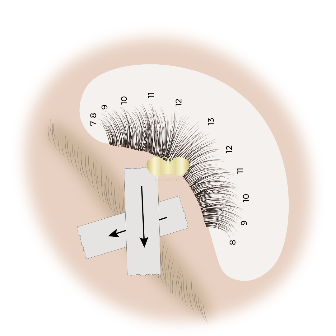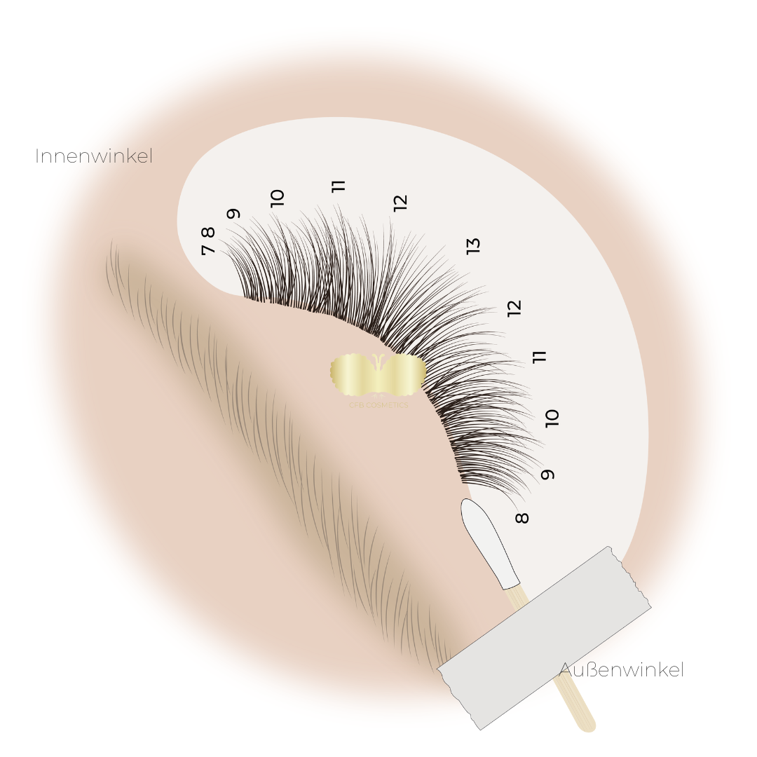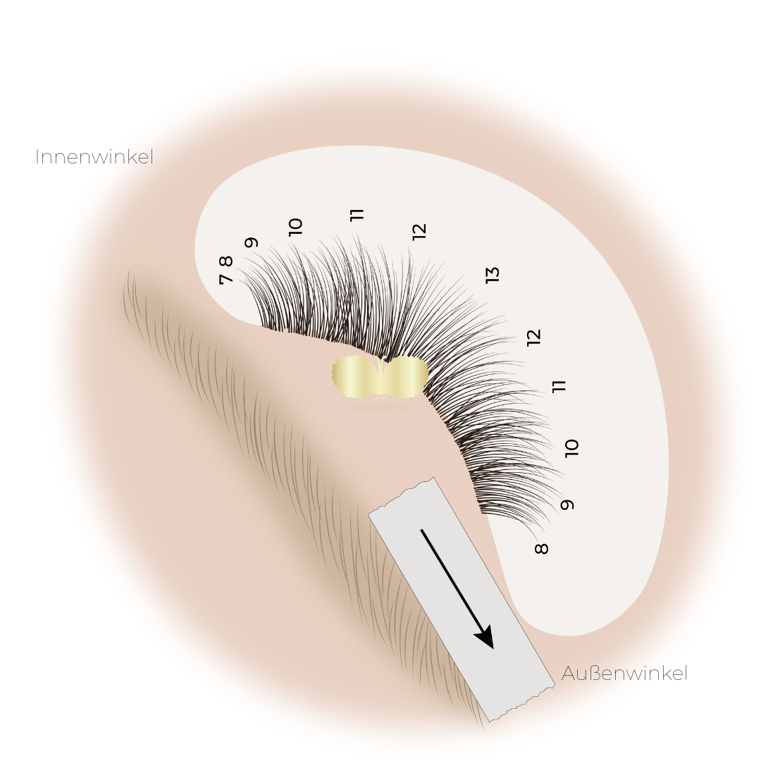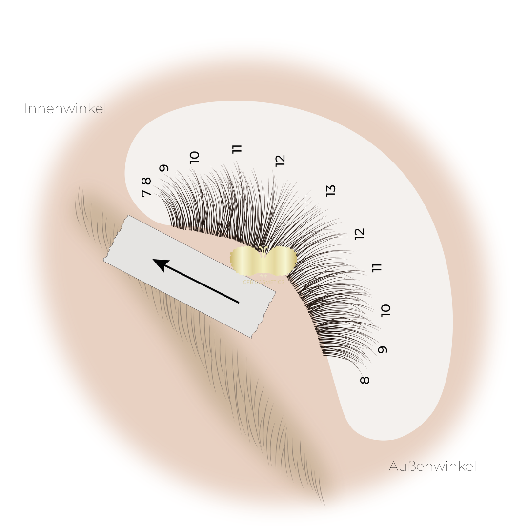Tapes können auch verwendet werden, um die sehr kurzen und feinen Wimpern im Innen- und Außenwinkel besser zu erreichen. Durch eine korrekte Anwendung der Tapes werden diese feinen Wimpern sichtbar gemacht und separiert. In den Illustrationen zeigen wir Ihnen, wie Sie dies umsetzen können.