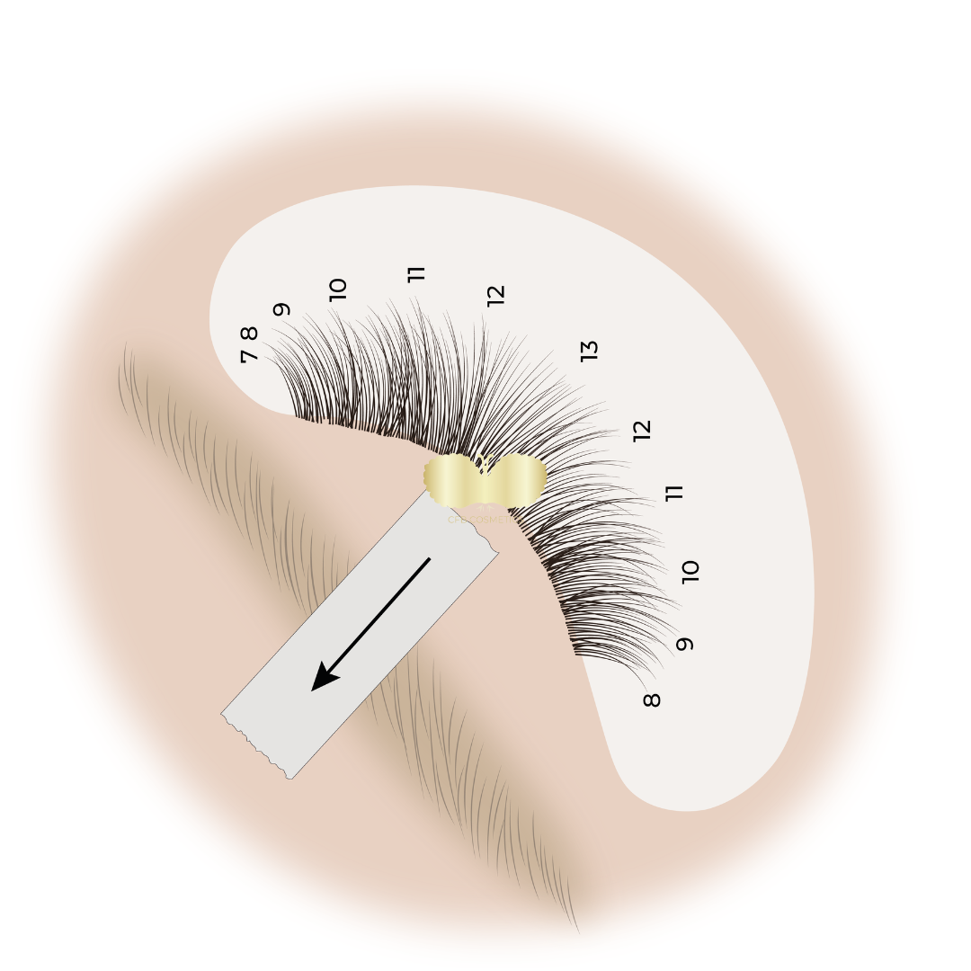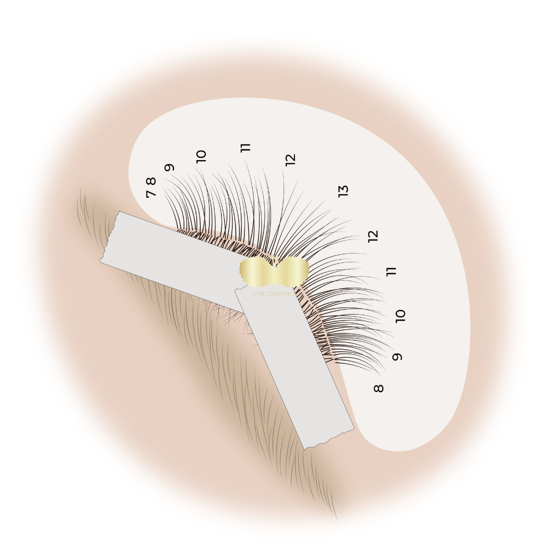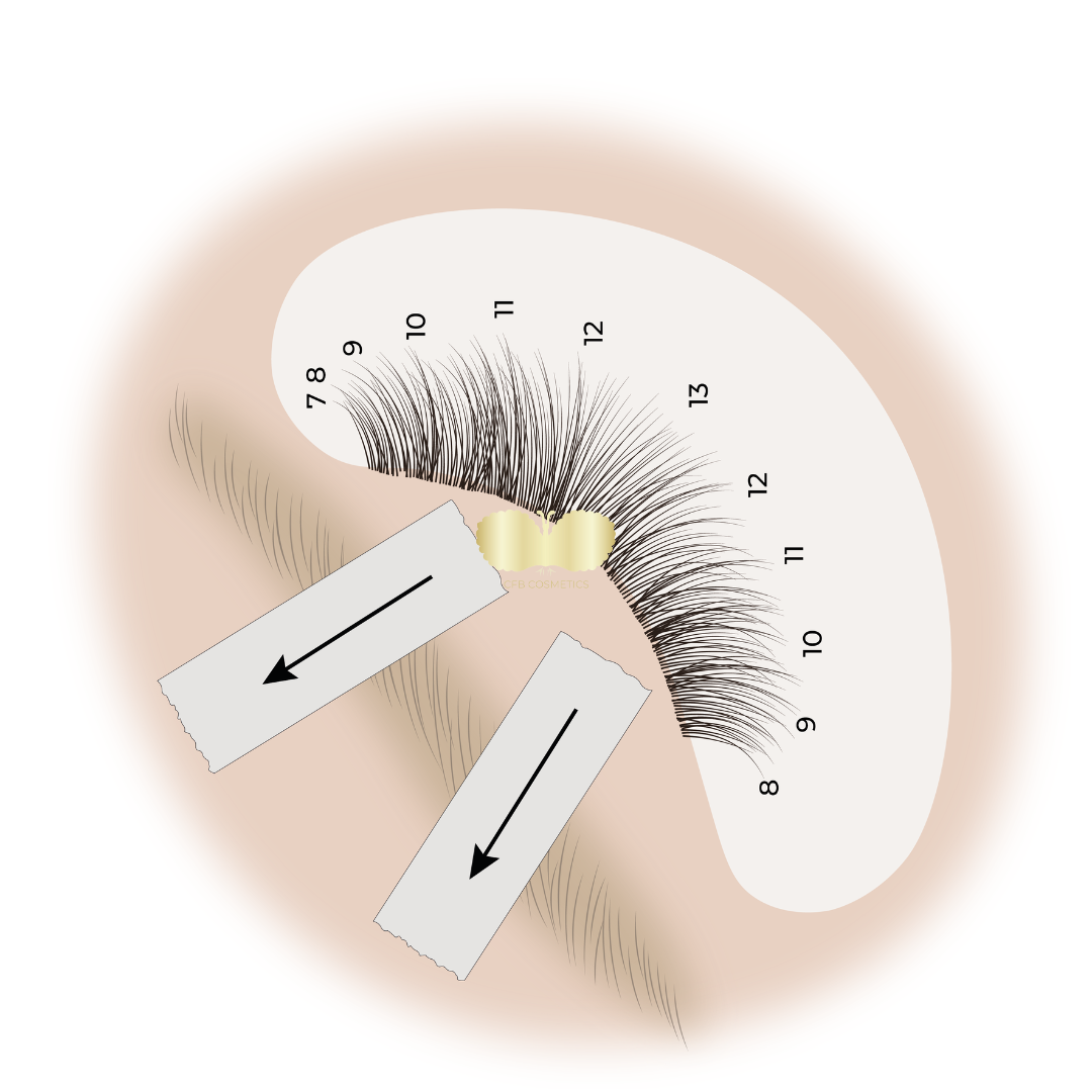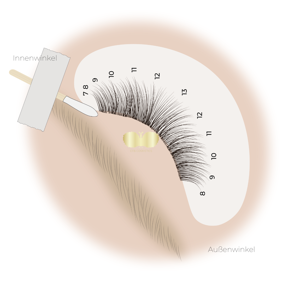 Tapes können auch verwendet werden, um die sehr kurzen und feinen Wimpern im Innen- und Außenwinkel besser zu erreichen. Durch eine korrekte Anwendung der Tapes werden diese feinen Wimpern sichtbar gemacht und separiert. In den Illustrationen zeigen wir Ihnen, wie Sie dies umsetzen können.